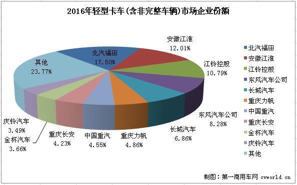 據(jù)中國汽車工業(yè)協(xié)會統(tǒng)計,2016年國內(nèi)輕型卡車(含非完整車輛)累計銷售1539820輛,同比累計下降1.20%。累計銷量前十企業(yè)共銷售1173797輛,占據(jù)整個輕型卡車(含非完整車輛)市場總銷量76.23%的份額。從增幅看,銷量前十企業(yè)6增4降,累計增幅最高的是中國重汽,達(dá)到35.59%,安徽江淮和重慶長安兩家企業(yè)的增幅也超過10%;降幅最大的是金杯汽車,達(dá)到59.08%。